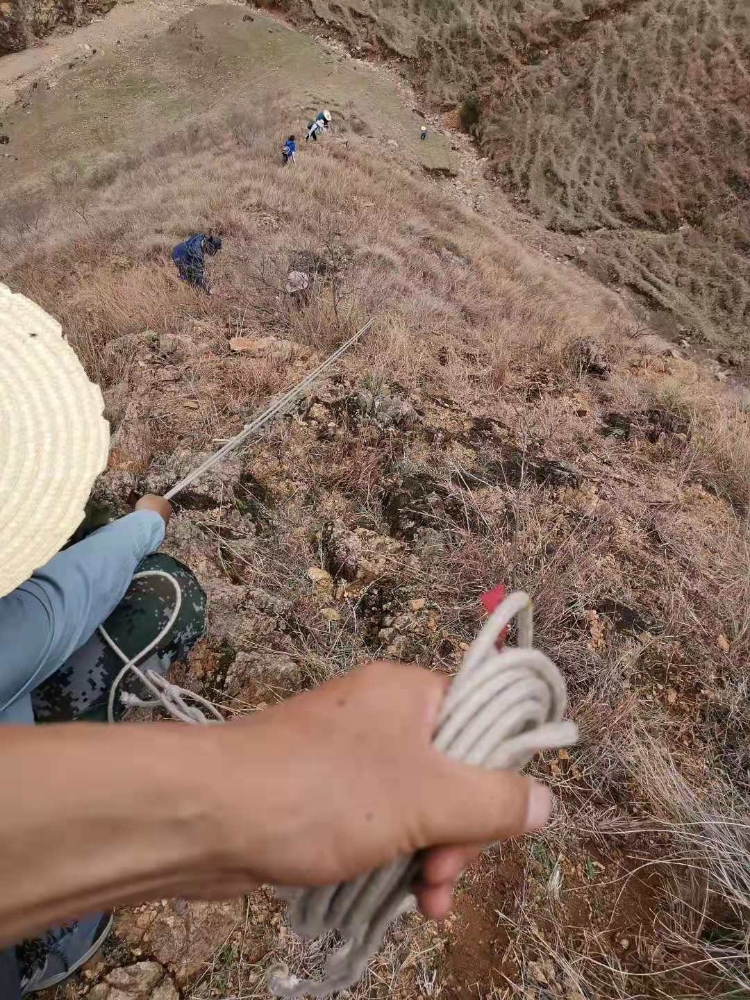 由于山势陡峭、险峻,全体队员相互协作,团结一致,攀绳而下